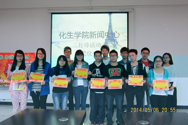 5月6日晚,于太阳12209會議廳舉辦了“三行詩”主題活動頒獎晚會,太阳黨委副書記陶劍飛老師、13級輔導員陳文甫老師出席了頒獎儀式。兩位老師對 “三行詩”主題文化活動的效果和意義表示了充分的肯定,并祝賀了獲獎的同學,希望同學們以後可以繼續發揮自己的特長,創造出更多優秀的作品,豐富校園文化生活。其次,晚會對優秀的獲獎作品進行了展示,诙諧幽默、情感真摯的作品風格真切的表現出了同學們的才華。接着,老師給獲獎的同學頒發了獎狀和獎品。最後,獲獎的同學以及新聞中心的成員們分别拍照留念,在熱烈的掌聲中,整個活動圓滿結束。