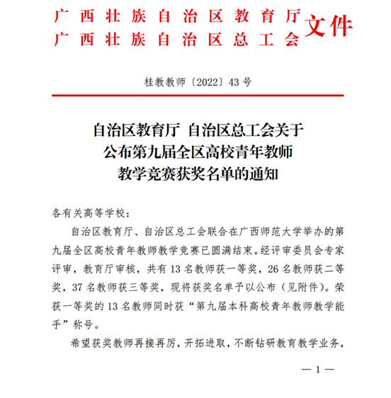 近日,自治區教育廳、自治區總工會聯合下文《自治區教育廳自治區總工會關于公布第九屆全區高校青年教師教學競賽獲獎名單的通知(桂教教師〔2022〕43号)》,公布了第九屆全區高校青年教師教學競賽獲獎名單,太阳及方華副教授獲工科組二等獎。